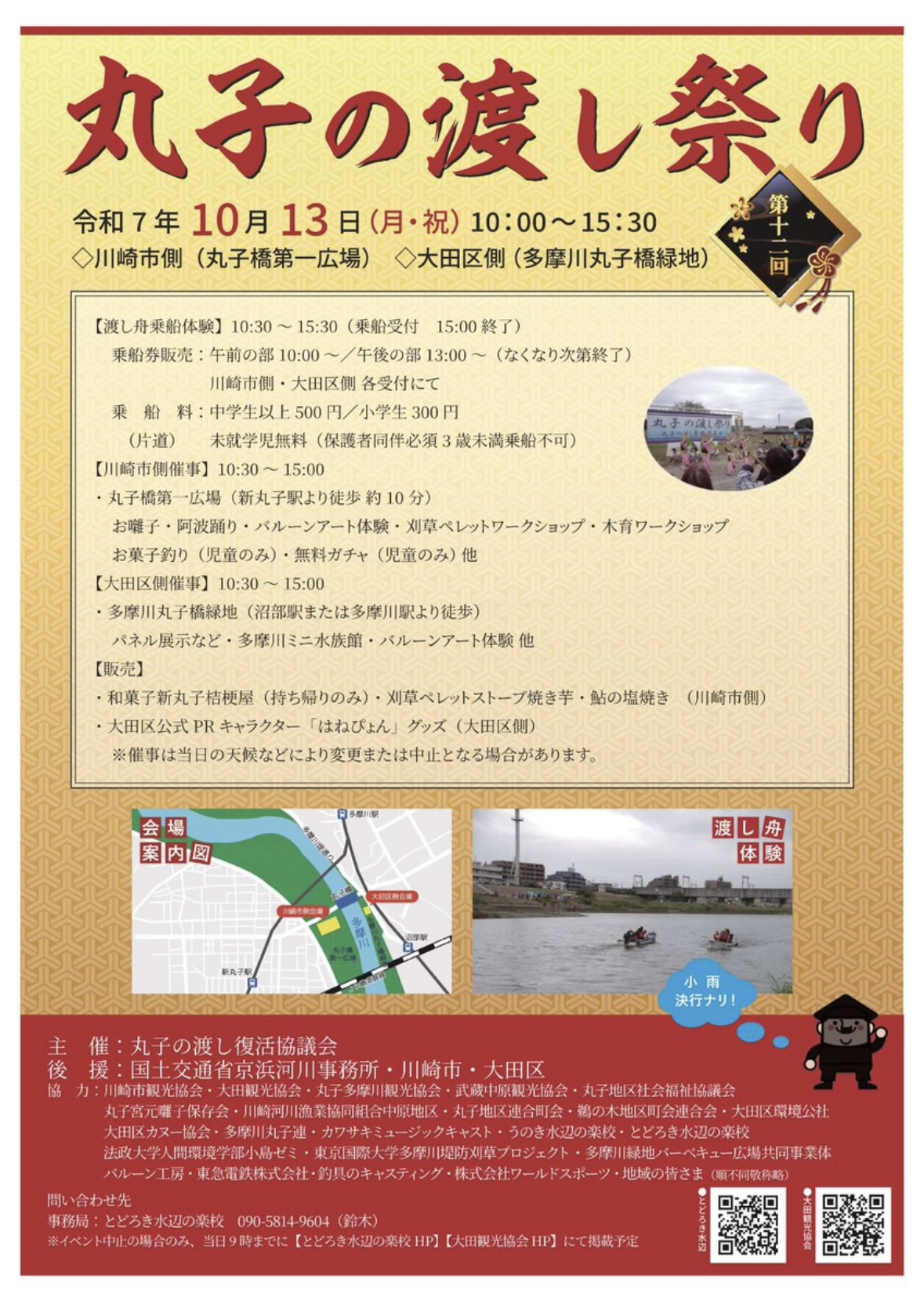 2025年10月13日(月・スポーツの日の祝日)に多摩川の丸子橋近くで、丸子の渡し祭りが開催されます!