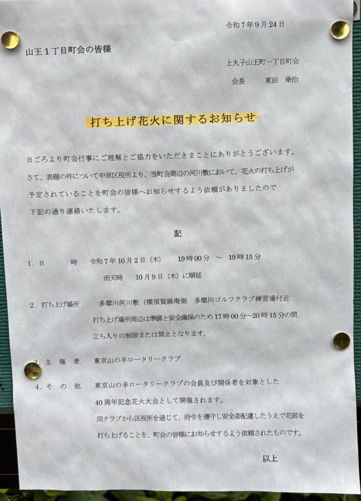 先日、10/4(土)の川崎市制記念花火大会のお知らせをしましたが、それに先んじて10/2(木)に多摩川河川敷にて打ち上げ花火があるそうです。