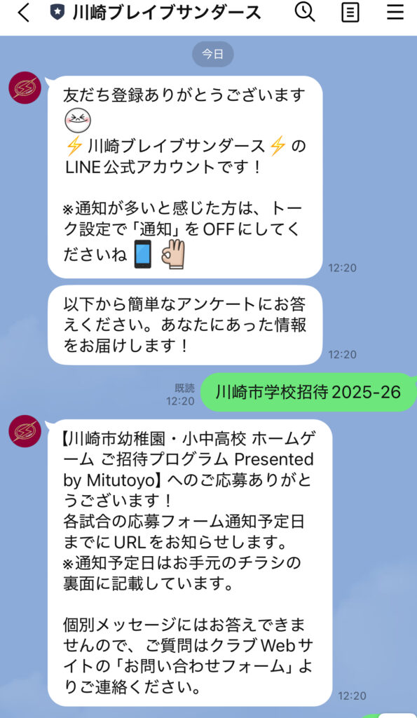 まず川崎ブレイブサンダースとLINEでお友だち登録が必要です。