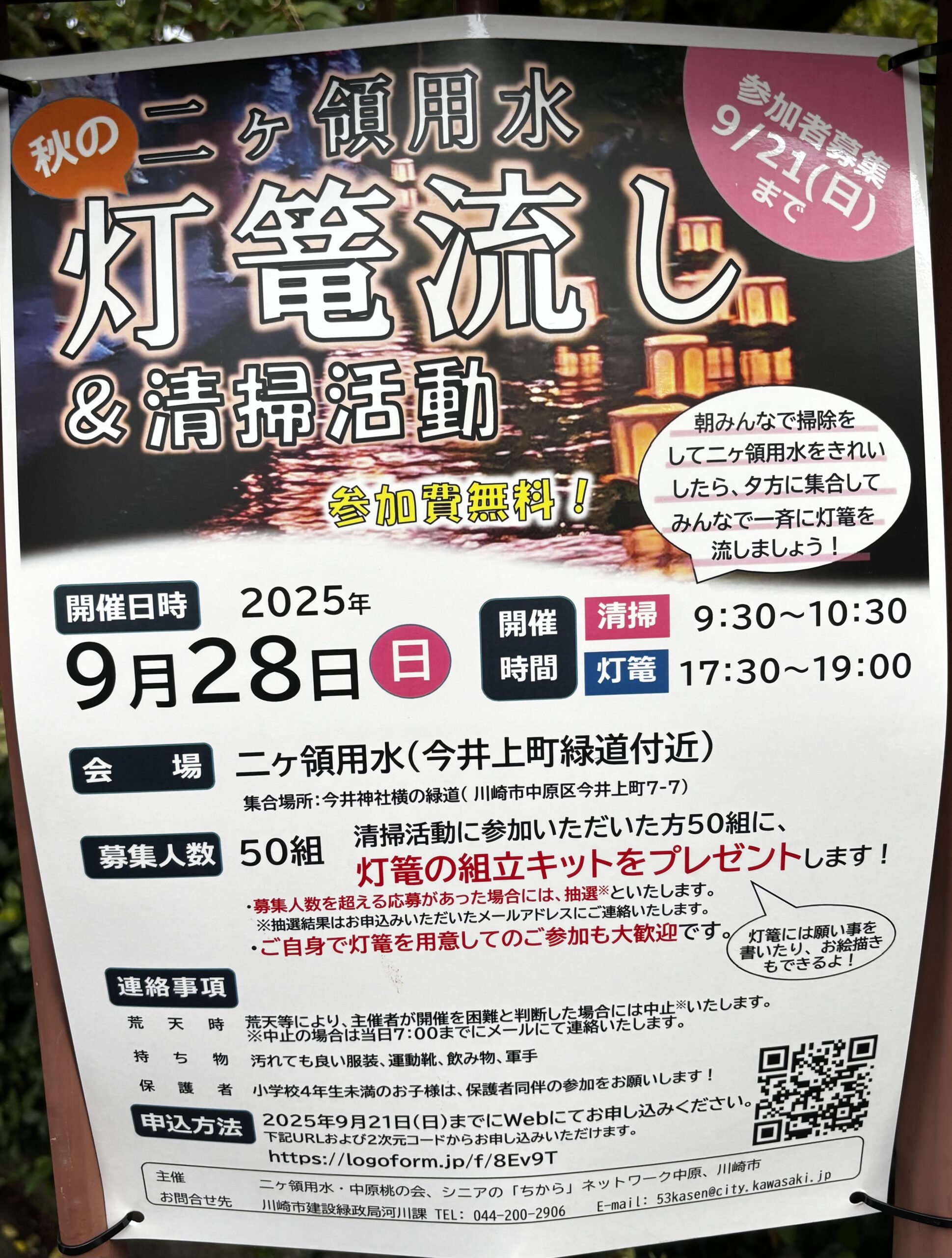 来週、9/28(日)に、二ヶ領用水で灯篭流しが開催されます🐸