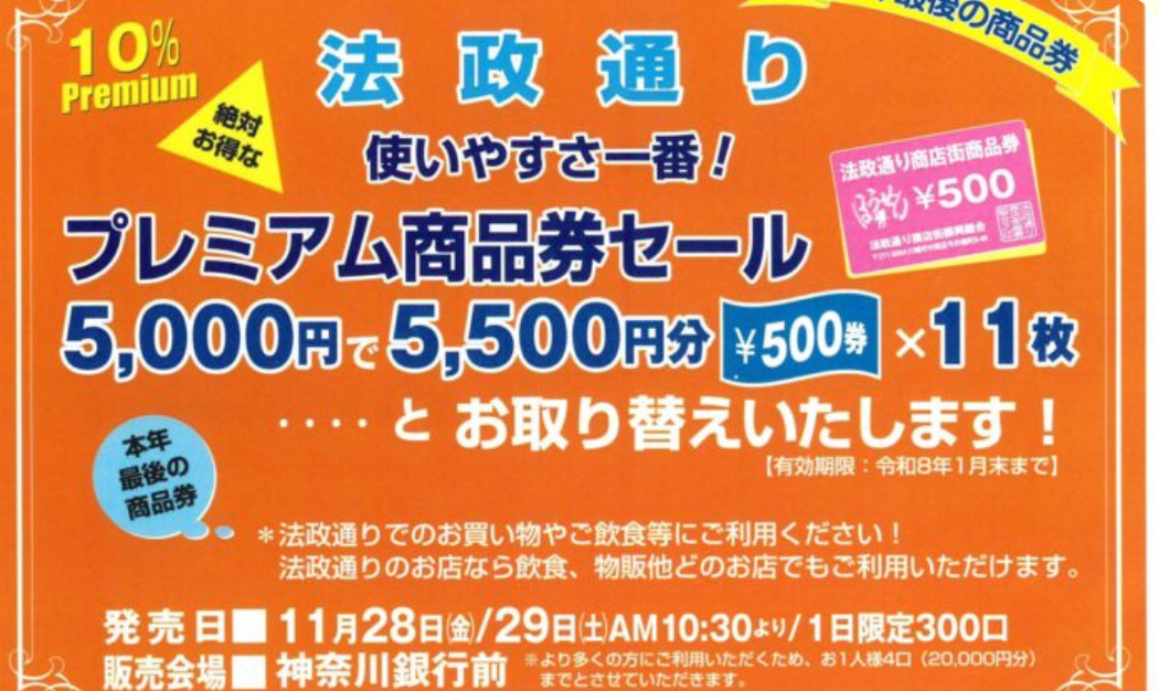 さて、今回は法政通り商店街で使えるプレミアム商品券配布のお知らせです。