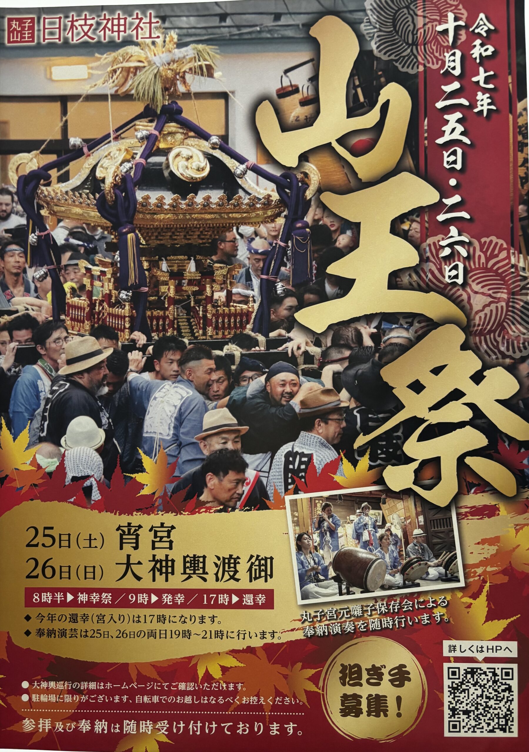 10/25(土)・26(日)は丸子山王日枝神社内にたくさんの屋台が並びます。両日とも、新丸子周辺の町内会のお神輿が担がれ、26(日)は、日枝神社のお神輿が新丸子周辺を練り歩きます。