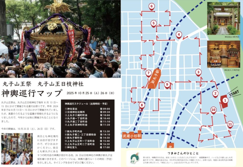 以前、開催日だけお知らせしました丸子山王日枝神社の例大祭。お神輿の巡行マップが新丸子のまちの文化祭小冊子に掲載されていますので、ご紹介します。