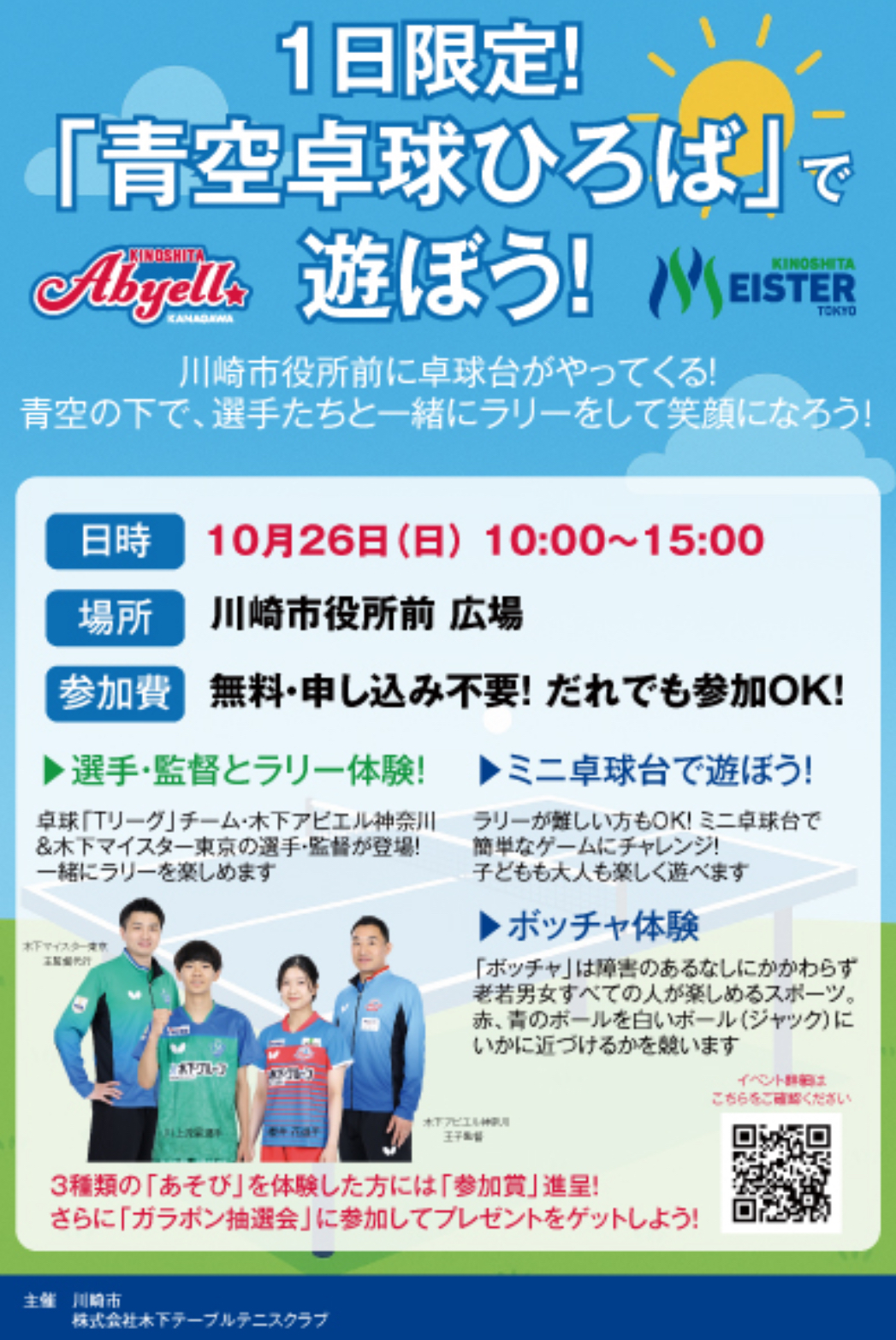 川崎に本拠地を置く、卓球の木下アビエル神奈川の選手や監督とラリー体験やミニ卓球台で遊んだりできる、「青空卓球ひろば」が10/26(日)に開催されます😊