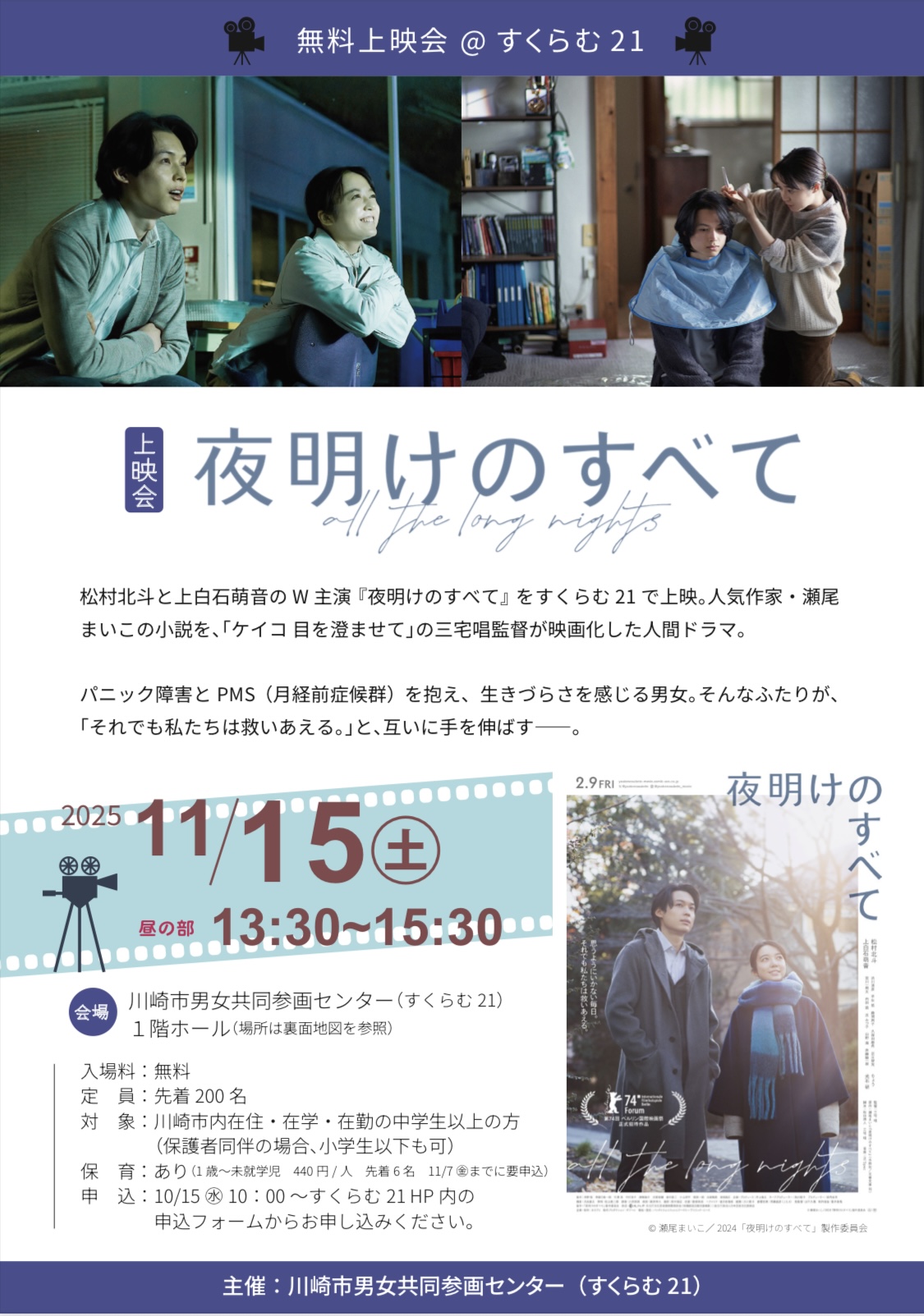 松村北斗と上白石萌音のW主演『夜明けのすべて』をすくらむ21で上映。人気作家・瀬尾まいこの小説を、「ケイコ 目を澄ませて」の三宅唱監督が映画化した人間ドラマ。パニック障害とPMS(月経前症候群)を抱え、生きづらさを感じる男女。そんなふたりが...