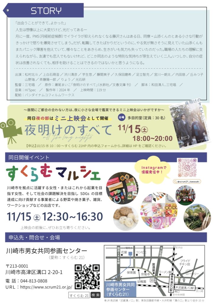 11/15(土)は、12:30〜16:30まで、すくらむマルシェも開催されているそうです。上映会の前後にぜひお立ち寄りください✨