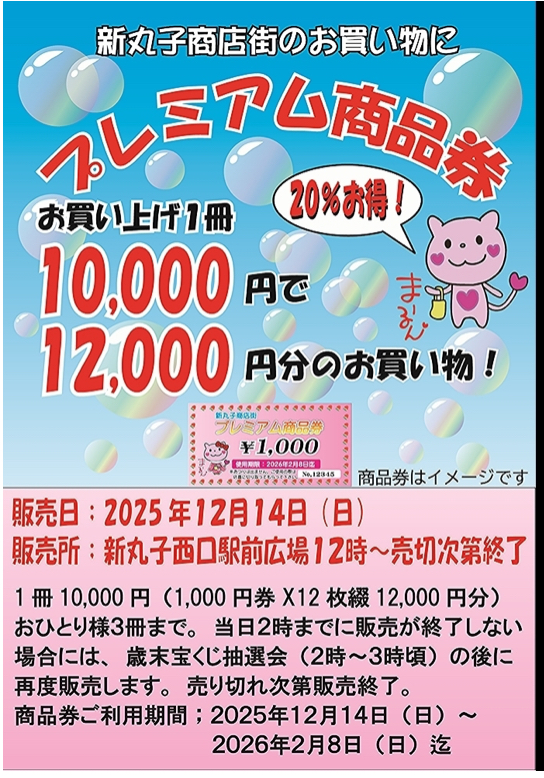 さて、今日は新丸子商店街で、来年の2/8(日)まで使えるプレミアム商品券配布のお知らせです😊