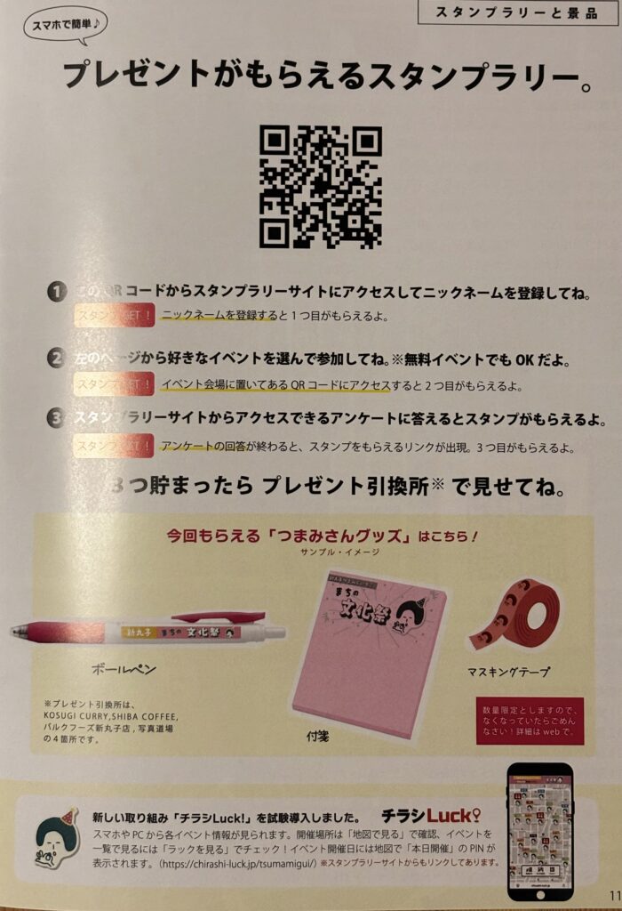 新丸子まちの文化祭では、スタンプを3つ集めると、プレゼント🎁がもらえます!プレゼントは、つまみさんのボールペン、付箋、マスキングテープ。新丸子でしかお目にかかれないつまみさんグッズ❣️数量限定なので、3つ貯まったら早めに引き換えしてもらうのが良いですね✨